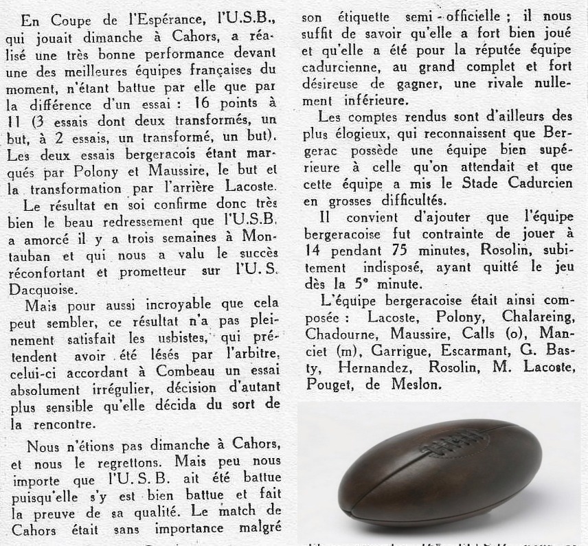 1957.1958 Cahors chez eux Challenge de L’Espérance Défaite 16 à 11