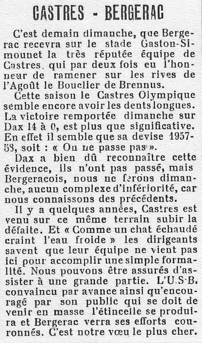 1957.1958 Castres au Stade Gaston Simounet Bergerac Défaite 3 à 0