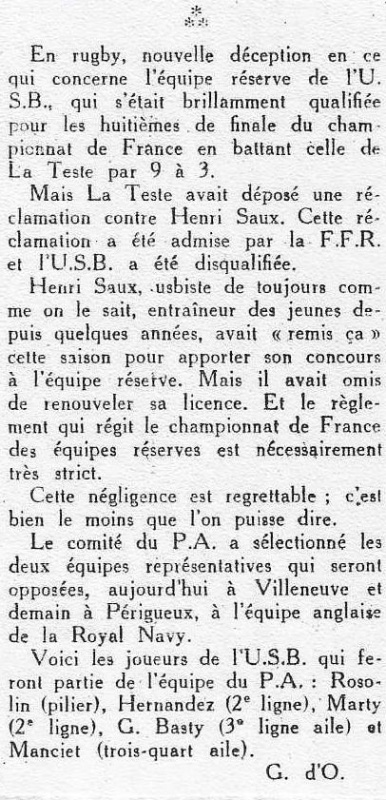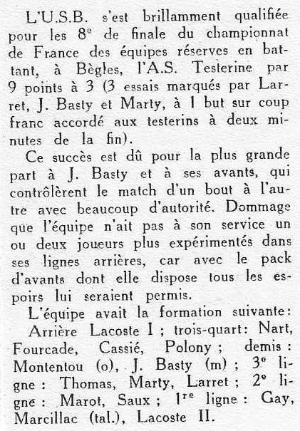 1957.1958 Réserve USB vs La Teste à Bègles 16ème Finale France 8 à 3 Victoire 9 à 3 mais perdu Tapis Vert
